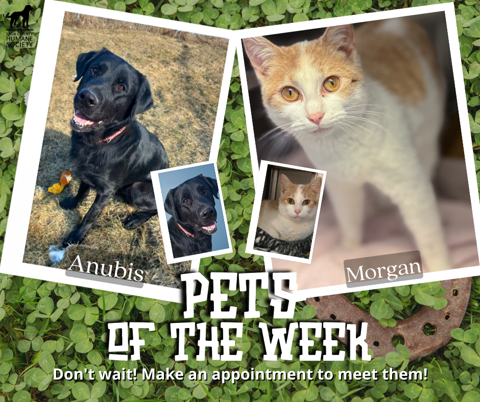 This week’s SCHS Pets of the Week are Anubis and Morgan. To make an appointment to meet them, call us at 608-356-2520.